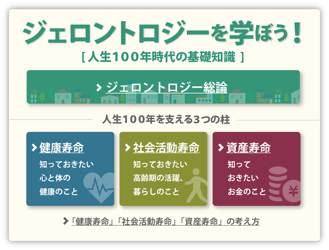 このコーナー「ジェロントロジーを学ぼう」では、そうした見直しとチャレンジを後押しすべく、個人にとって「人生100年を自分らしくより良く生きていくうえで役立つ情報」、地域・市場・社会の側から「人生100年を支え、導くうえで有益な情報」を、人生100年を支える重要な柱である「健康寿命」「社会活動寿命」「資産寿命」のカテゴリーに分けてお届けします。