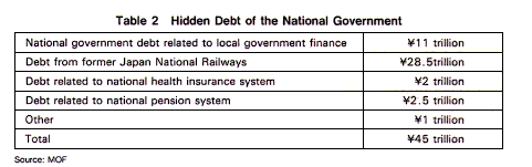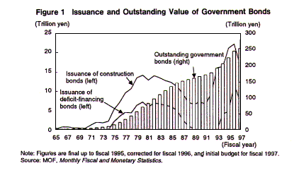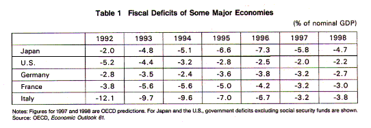 Another aspect of the problem has been the government's complicated accounting system, which has allowed superficial progress to be made in deficit reduction without any substantive progress. Through these manipulations, bond issues were ostensibly curtailed, while the actual debt accumulated as the government's "hidden debt" has grown to an estimated 45 trillion yen as of the end of fiscal 1997. In addition, the lack of limits on the issuance of construction bonds has created constant pressure to increase public works spending in annual budgets as well as in economic stimulus packages. The adoption of an overall target defined by the ratio of fiscal deficit to nominal GDP renders the superficial deficit reductions meaningless, and also serves to limit the issuance of construction bonds.