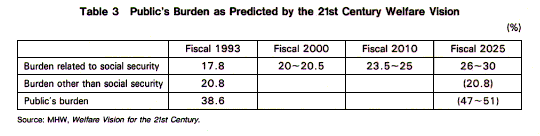With the aging of society, to maintain pensions and medical insurance under the social security system in the 21st century, the public's share of these burdens will have to rise. In the Health Ministry's "Welfare Vision for the 21st Century" of 1994, the public's burden in fiscal 1993 was divided into a social security component (17.8 percent) and other component (20.8 percent), and the social security component was predicted to rise to approximately 30 percent by 2025. It is now clear that this prediction was overly optimistic, and that the public will have to bear an even greater portion of the burden as the society ages.