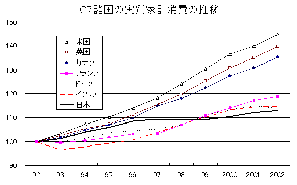 (注)各国の1992年における実質家計消費を100に基準化した指数