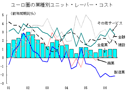 | 1.強まる企業の価格、賃金設定への圧力 2007年のユーロ圏は2年連続での潜在成長率を上回ると成長が見込まれているが、インフレ率は、ユーロ発足以来、初めて、欧州中央銀行(以下、ECB)が定義する物価安定(2%以下でその近辺)の範囲内におさまることになりそうだ。 しかし、こうした高成長下での物価安定という「理想的な」見通しは、原油価格が前年同月を下回るという前提に負うところが大きい。ユーロ圏では、ここにきて稼働率の上昇、失業率の低下ペースが加速しており、内生的なインフレのリスクを警戒する必要はむしろ高まっている。 ポイントとなるのは、素原材料の上昇や税率の引上げを吸収してきた企業部門の、価格や賃金設定の行動に生じる変化だ。うち、価格設定に関しては、エネルギー価格の伸びがピーク・アウトする一方、稼働率の高い資本財価格は上昇、中間財価格は高止まるなど、価格転嫁の動きが見られるようになっている。 2.ユニット・レーバー・コストの動きに注目