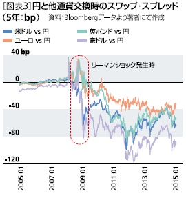 [図表3]は、他通貨(米ドル、ユーロ、英ポンド、豪ドル)と円を交換する通貨スワップについて、円調達サイドの追加的な調達コスト(スワップ・スプレッド)を計算したものである。リーマンショックまではゼロ近辺を推移していたものの、それ以降はすべて通貨に対してスワップ・スプレッドがマイナスの状況が恒常的に続いていることが分かる。逆に、円を保有していた他通貨調達サイドの投資家から見ると、どの通貨で資金調達したとしても相対的に調達コストがかさむ環境にあることになる。ミッドレートで、米ドルと円のスワップ・スプレッド(5年)が▲65bp、ユーロと円のスワップ・スプレッド(5年)が▲30bp、英ポンドと円のスワップ・スプレッド(5年)が▲55bp、豪ドルと円のスワップ・スプレッド(5年)が▲90bpである(2015年2月末時点)1。