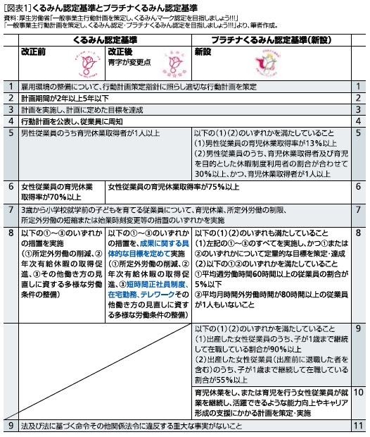 [図表1]は、改正前後のくるみん認定基準とプラチナくるみん認定基準を比較したものである(プラチナくるみんマークの色は、認定を受けた企業が12色のパターンから選択できる)。