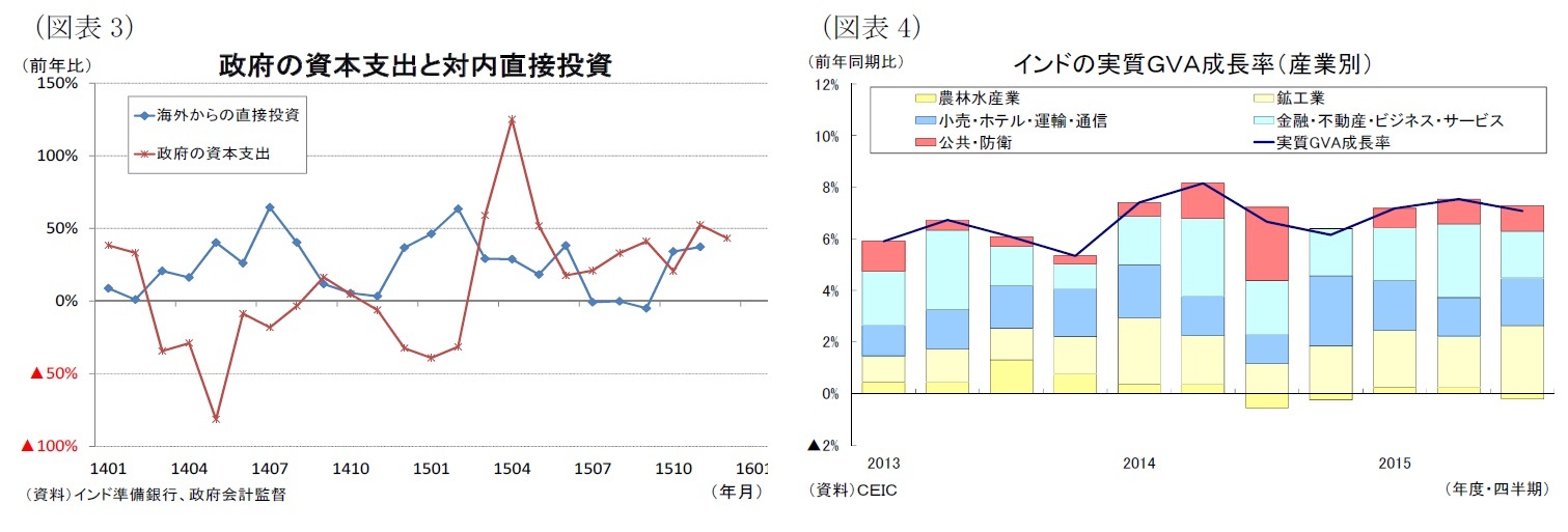 さらに政府は11月に敗北したビハール州議会選挙後、外国直接投資の規制緩和を発表している。シングルブランドの小売業や国防、土地開発・建設などの分野で一定の規制緩和が実施される見込みである。こうした経済改革の進展が伸び悩みつつある投資を下支えするだろう。
