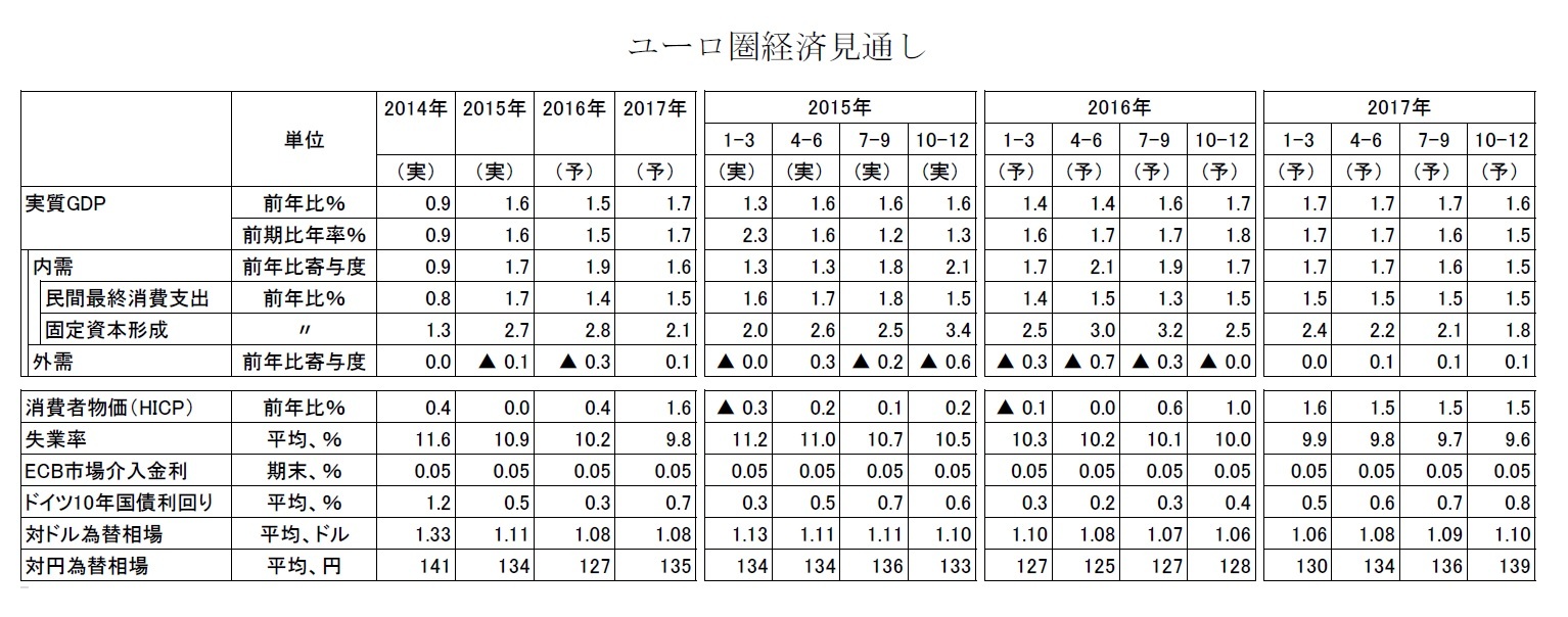 - 16年のユーロ圏は前年比1.5%成長と、15年に続き内需主導型の潜在成長率を超える成長が続くと予測する。