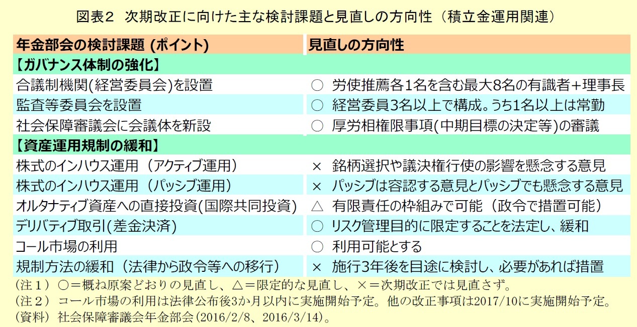 資産運用規制については、現在の法律で認められていない運用方法を認めることと、資産運用規制の規定を法律から政令等に移行して機動的にすることが、検討された。新たな運用方法としては、株式のインハウス運用のほか、不動産(インフラ)などオルタナティブ資産に対して海外の年金資金と共同で直接投資することや、リスク管理を主眼にデリバティブ取引(差金決済)を行うことなどが、厚生労働省から提示された。