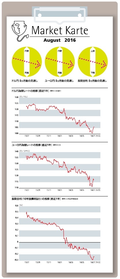 ただし、今回にわかに訪れた円安の持続性は期待できない。まず、日銀の追加緩和に関しては、一部でヘリコプターマネーの思惑が高まるなど、過度の期待を織り込んでいる。筆者も早期の追加緩和を予想するが、期待を超えることは至難の技だ。また、今後はBrexit決定後の経済指標が出てくるが、英国を中心とする欧州の指標下振れなどからBrexitの影響への懸念が高まり、リスク回避の円高が再発する可能性がある。米国もBrexitの動向と影響を見極めるべく、しばらく利上げを見送るとみられ、ドル高エンジンも息切れしそうだ。従って、3ヵ月後のドル円は、105円を下回ると予想する。