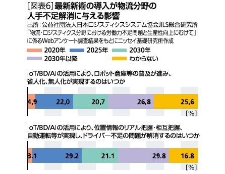 最新技術等を活用し、物流の現場における人手不足を解消する取組みが進んでいるが、技術・安全面でクリアすべき課題が多い。2017年12月に日本ロジスティクスシステム協会が実施したアンケート調査においても、最新技術の導入により2020年までにドライバー不足および倉庫内作業員不足が解消できるとする回答はまだ少数である[図表6]。