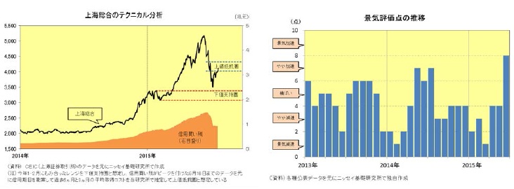 - 中国では株価が急落した。それまでの株価急騰は企業業績が悪化する中での出来事であり、景気テコ入れ策の実施を期待した“金融相場”だったといえる。“金融相場”が終了して、現在は個人投資家から機関投資家へと、保有者が交替(“手替わり”)する局面にあることから、相場は乱高下している。新たな買い手となる機関投資家は景気指標を重視して投資する。