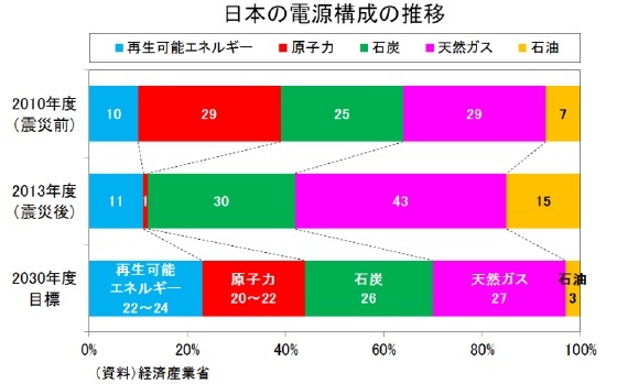 26%の削減の内訳は、森林整備やフロン対策で4.1%、そして再生可能エネルギー(以下、再エネ)の導入拡大や原発の再稼動で21.9%削減するというもの。温室効果ガスの排出は化石資源(石炭、天然ガス、石油)を用いた発電時によるものが大部分を占める。化石資源による発電比率を引き下げ、ゼロエミッション電源である再エネと原発の比率を現状よりも大幅に引き上げることで目標達成を目指すというものだ。