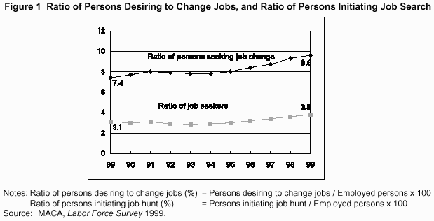 Amid major trends such as economic globalization, deregulation, and the IT revolution, the optimal allocation of human resources presents important challenges. Indeed, despite the prolonged severity of the employment scene, 9.6% of all employed persons in 1999 (6.23 million out of 64.62 million per-sons) expressed the desire to change jobs, of which 3.8% (2.46 million) initiated job searches. This trend is expected to continue growing (Figure 1).