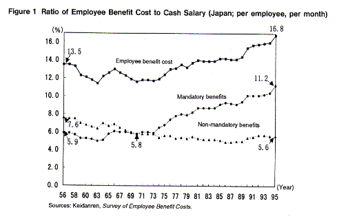 2. The Cafeteria Plan and Employee Welfare Costs (1) Does the Cafeteria Plan Restrain Rising Mandatory Benefit Costs? Looking at the ratios of employee benefit costs to cash wages at Japanese companies, mandatory benefit ratio overtook the non-mandatory benefit ratio in 1970, and the gap has since widened (Figure 1). In 1995, the mandatory benefit ratio reached 11.2 percent, while the non-mandatory benefit ratio has remained constant at approximately 5.6 percent. Moreover, the trend toward fewer children and aging of population ensure that mandatory welfare costs will continue rising.