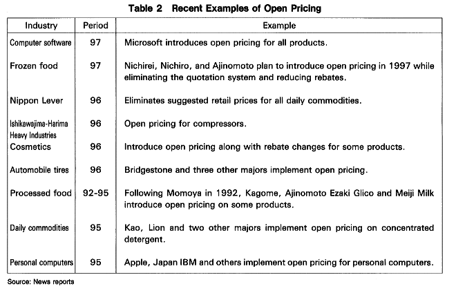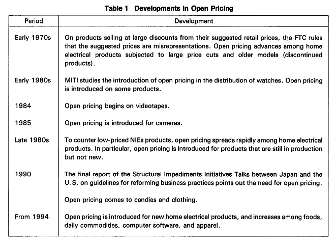 2. Open Pricing Gains Momentum in the 1990s Although attention has focused on open pricing in association with Japanese business practices only in the past few years, the practice itself dates as far back as the early 1970s (Table 1). A major social problem erupted when home electrical products were sold at big discounts over manufacturers' listed prices. When the Fair Trade Commission ruled that such listed prices constituted misleading representation, manufacturers turned to open pricing. However, only discontinued products became subject to open pricing at that time.