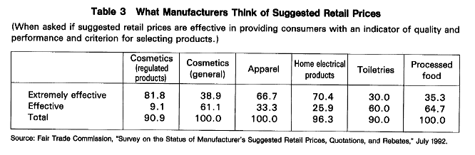 1. Product quality indicatorSince manufacturers price their products in relation to the functions and quality of competitors' products, the suggested retail price signals to consumers a product's value. Surveys show that manufacturers are strongly aware of this (Table 3). Also, many consumers insist they cannot judge product quality without referring to the suggested retail price.