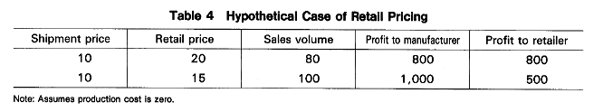 4. More profit for manufacturersIn areas where local retail competition is moderate and transportation is limited, consumers usually shop at the most convenient store. The retailer then enjoys monopoly power locally. If allowed complete freedom to set prices, the retailer will mark up prices above what the manufacturer desires, resulting in lower sales volume and less profit than expected to the manufacturer. Having a suggested retail price establishes a price ceiling, and enables the manufacturer to enjoy more profit. Consider the example in Table 4. Suppose the manufacturer's shipment price is 10 yen. Depending on whether the retail price is set at 15 or 20 yen, sales volume and profit to the retailer and manufacturer will vary. If allowed to set the retail price, the retailer will charge 20 yen (to enjoy a larger profit margin), leaving the manufacturer with a profit of 800 yen. But if there is a suggested retail price of 15 yen, the retailer cannot charge more than 15 yen; more units are sold, and the manufacturer earns 1,000 yen in profit.