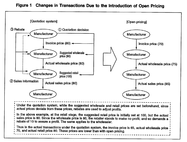 Attention has recently focused on the growing practice of "open pricing," in which manufacturers do not post a suggested retail price on their products. There are two reasons behind this interest. First, open pricing symbolizes a major shift in Japan's postwar distribution system, a system that has tried to discourage the entry of large retail stores, manufacturers organized wholesalers and retailers into "keiretsu," and used Japanese business practices such as the setting of manufacturer's "suggested retail prices." However, this system has changed significantly in recent years. The easing of distribution regulations and changing consumer lifestyles have encouraged the growth of large retailers, and the shifting balance of power among manufacturers, wholesalers and retailers has caused manufacturer-controlled distribution systems to loosen up. In addition, competition has intensified among retailers. Under the new arrangement, the inefficiencies of Japanese business practices have become particularly noticeable. Presently, there is a growing movement to build a new distribution system that corrects these inefficiencies and has been adapted to the changes. The practice of open pricing is an important element of this movement, and its progress is being scrutinized. Second, the impact of open pricing cannot be measured at present. Many manufacturers are adopting open pricing and at the same time abolishing or simplifying rebates to sellers to reduce sales promotion expenses while avoiding excessive price competition at the retail level. Open pricing has indeed led to the reevaluation of rebates and simplified transactions. However, the overall impact remains unclear, since most open pricing schemes do not go far enough in eliminating rebates. Results will gradually come to light as the practice develops further.