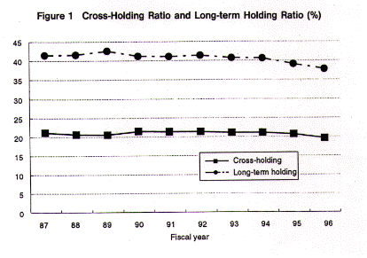As of the end of March 1997, the cross-holding ratio stood at 19.63 percent and the long-term holding ratio at 37.82 percent. These results and the stock distribution survey results are shown in Figure 1.