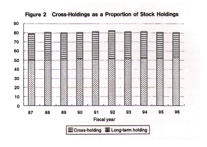 - However, with the spate of stock-related scandals, recent discussions suggest that there may be overreaction. A typical argument expresses concern that if cross-holdings and long-term holdings collapse and stocks flow into the market, the market will deteriorate and stock prices will plunge.This is in marked contrast to the objective analysis in a June 1997 report by the U.S. Congressional Research Service entitled "Japanese Bank Ownership of Corporate Equities: Structure and Economic Effects": "As U.S. policymakers consider proposals for banking deregulation, Japan's experience may indicate some possible effects of allowing U.S. banks to expend their holdings of corporate equities and to engage more in the securities transactions."