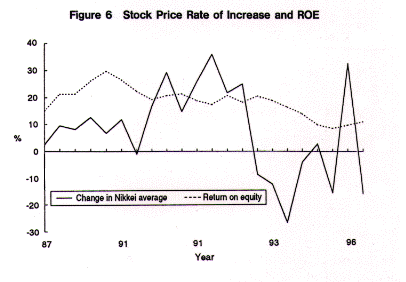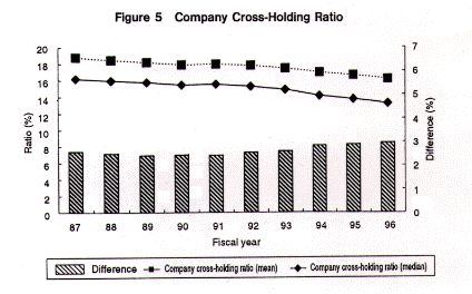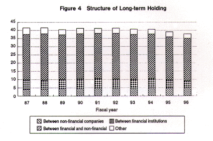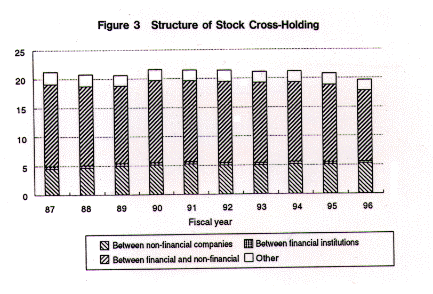 For example, at the end of fiscal 1996, the cross-holdings of operating companies in financial stocks fell 1.49 percent to 4.28 percent, a 3.04 percent decline from the peak in fiscal 1987. However, we should point out that bank stocks experienced significant price declines, amplifying the changes on a value basis.