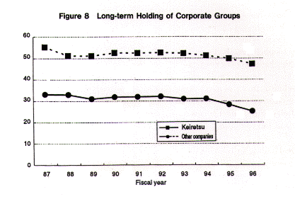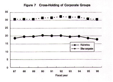 In fiscal 1996, the average stock cross-holding ratio of the six groups fell 0.34 percent but still remained at a high level of 30.55 percent (the non-keiretsu average is 17.83 percent). In addition, the cross-holding ratio within the corporate groups was 11.59 percent. The long-term holding ratio of 47.47 percent was much higher than the 25.31 percent among non-keiretsu companies.
