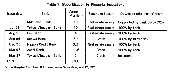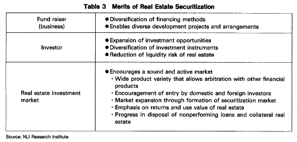 Separate from these small-denomination products advanced by the real estate industry, securitization methods have been adopted recently for the disposal of nonperforming loans of financial institutions. These products involve complicated arrangements developed for a limited number of institutional investors, and have practically no liquidity. In addition, their real estate collateral, which ultimately needs to be sold, carries a downside price risk which is generally borne by financial institutions who originated the structure (Table 1).