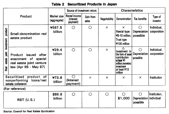In theory, securitized real estate products, like other financial products, should be liquid and negotiable so that investors including individuals can freely buy and sell them. However, the products that have appeared thus far−syndicated real estate investment products and securitized products from real estate collateral of nonperforming loans−are available only to a limited group of investors and practically illiquid (Table 2).
