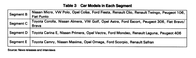 In contrast to Nissan, Toyota is concentrating on expanding market share. In 1997, Toyota aims to increase sales by 5% to 430,000 units by increasing supply of the Starlet, RAV4, Picnic (called the Ipsam in Japan), and Colorado (Land Cruiser). Doing so would put Toyota within range of challenging Nissan's lead in Europe (433,000 units in 1996). In addition, in 1998 Toyota plans to double its production capacity in the U.K. to 200,000 units, adding the Corolla class (segment C) to the present Carina E (Corona, segment D), and aim for sales of 600,000 units in 2000.