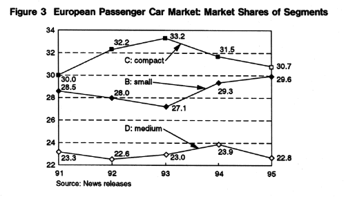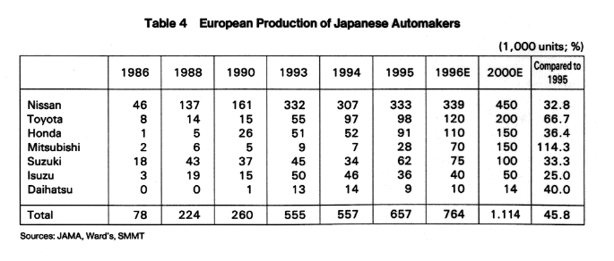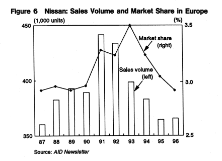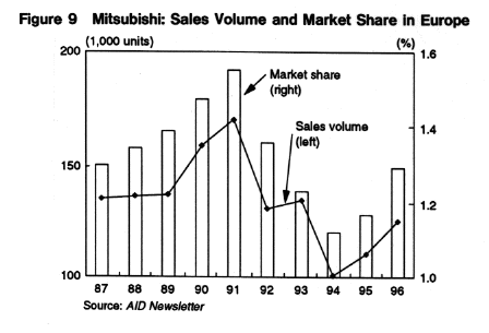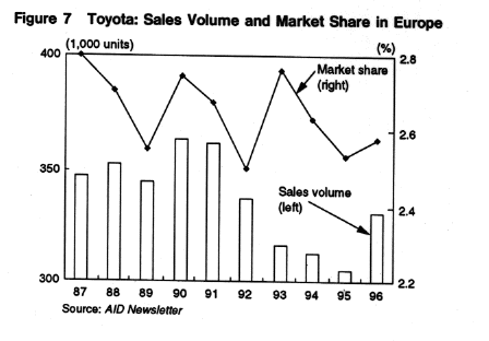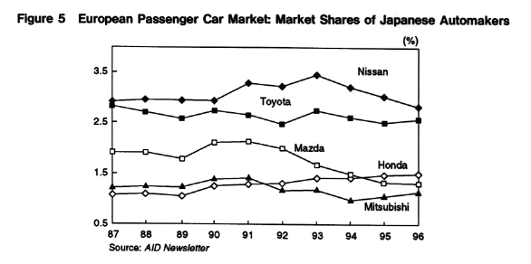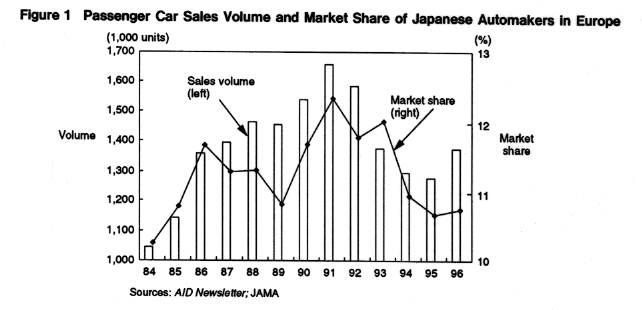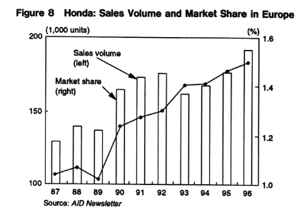 For Japanese automakers, competition has proved to be more intense in Europe than in Japan or North America. Their market share improved slightly in 1996 has still declined from 12.3% in 1991 to 10.8%, the same level as 1985, due partly to exchange rates. Indications are that the hard times are not over, and their profit and sales have yet to justify their investment.