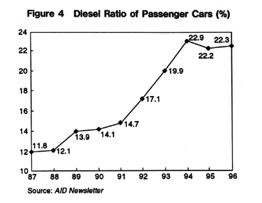 There is a strongly rooted demand in Europe for diesel engines owing to their low-cost maintenance and environmental policies that emphasize carbon dioxide emissions. In France, 46.5% (1995) of passenger cars have diesel engines. AID, a market research company, predicts that the percentage for the overall European market will increase from 22.3% (2.65 million units) in 1995 to 30% (4.3 million units) by 2004. This rapid growth in the ratio of diesel passenger cars poses an obstacle to Japanese automakers trying to expand their presence in Europe, and an immediate response is needed.