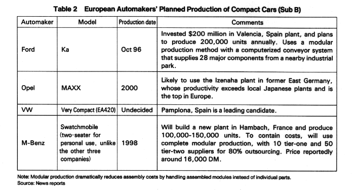 European automakers keenly feel that their existence depends on being in harmony with society's concerns over the environment. This is driving them to pursue low-cost production of unprofitable small cars through radical modularization (see note under Table 2). Experimental production is underway in low-cost locations. Modularization is intended to overhaul the production process by standardizing modular components, converting materials, and modifying and reducing processes, thereby dramatically cutting costs.