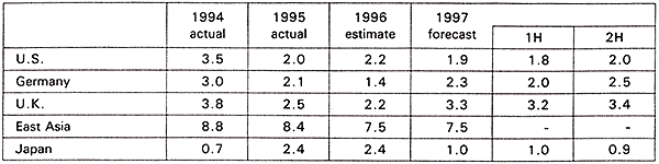 - East Asia's (NIEs, ASEAN and China) growth rate remains high, but will drop from 8.4% in 1995 to 7.5% in 1996 due to monetary tightening, reduced competitiveness from high exchange rates, and the worsening semiconductor market. In 1997, the region's growth rate will be roughly the same; monetary easing will boost China's recovery, but this will be offset by a slowdown in Korea and other factors.