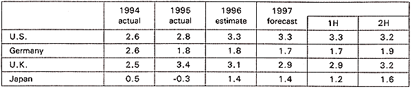 The U.K. is ahead in the interest rate cycle. Preventive monetary tightening kept the economy sluggish in 1995, and despite interest rate cuts at year-end, under monetary easing, housing market and income growth, consumer spending accelerated, reached 3.0% annual rate by the third quarter. The acceleration will continue as capital investment also increases. The economy's growth rate will rise from 2.25 in 1996 to 3.3% in 1997. Inflation will exceed the government's target. A base rate hike from 5.75% to 6% was implemented in late October, and if the Labor Party wins the general election likely to take place next spring, it will further hike rates to signal its anti-inflationary stance.