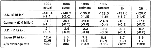 - The yen/dollar exchange rate, which set a record of 79.75 yen in April 1995, subsequently underwent continued correction toward a stronger dollar and presently is in the 100 yen range. The exchange rate will rise slightly in FY 1997 and average 105 yen (compared to 109 yen in FY 1996) because although the interest rate spread between domestic and foreign rates will remain large, Japan's rising external surplus, the economy's improvement in the second half of 1997, and the probability of interest rate hikes. The yen will weaken slightly in the first half due to the economy's weak performance.