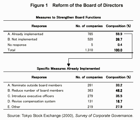 Following the collapse of the bubble economy, Japanese companies have performed dismally, while a series of improprieties has rocked the foundations of many. With the lack of management discipline brought into sharp relief, the lack of governance has is regarded as a major contributor to the present state of business affairs. From the late 1990s, various attempts have been made to address this problem, including the structural reform of management for companies to autonomously achieve good governance. Measures include the introduction of executive officers and independent outside directors (Figure 1).
