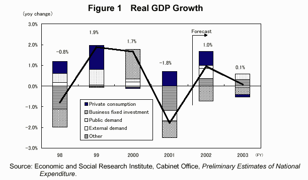 - The economy will achieve real growth of 1.0% in fiscal 2002, but slow to 0.1% in fiscal 2003 due in part to mounting deflationary pressure from the disposal of bad loans. With prices still declining, nominal growth will remain negative at -0.6% in fiscal 2002 and -1.2% in fiscal 2003.