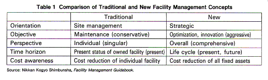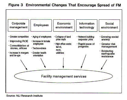 With Japanese companies earnestly pursuing cost reduction following the collapse of the bubble economy, a foundation is forming for the penetration of facility management. Restructuring and reengineering personnel cutbacks and organizational changes are raising the need for reevaluating office space. In addition, the collapse of the land price myth and management focused on return on equity, emphasis on the effective and efficient use of real estate. To pursue a management innovation, there is a growing need to restrain investment and construct offices suited to the particular work or process at appropriate prices.