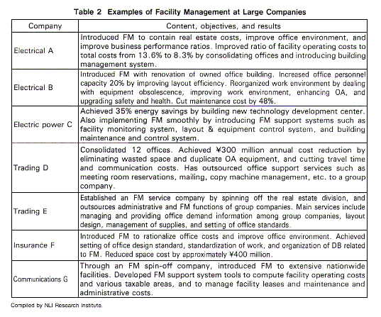 The facility management concept came to Japan in the mid 1980s. While early attempts were rudimentary and consisted of facility maintenance, full-fledged implementation increased as the concept gradually spread (Table 2). One large company consolidated 12 office locations into two, and succeeded in reducing office costs by 300 million yen per year while expanding the total floor space and improving the office environment.