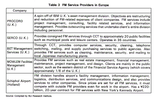 In the West, many companies have successfully introduced facility management on a large scale and reduced office costs by 30 to 50 percent. As for service providers, Europe in particular has several companies that specialize in providing comprehensive FM services including FM operations, consulting, and project management (Table 3).