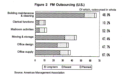 One factor behind the widespread use of facility management has been the penetration of outsourcing practices, which seek to use external resources for greater efficiency. According to a survey by the American Management Association (AMA), U.S. companies outsource much of their FM-related operation, in some cases all of it, to service providers (Figure 2).