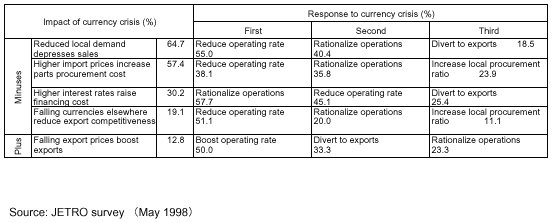The ASEAN currency crisis, led by the Thai baht's decline in July 1997, dealt a severe blow to local subsidiaries of Japanese manufacturers. A JETRO survey of Japanese electronics makers one year later revealed that the greatest harm was to production sites supplying the local market (Table 1)