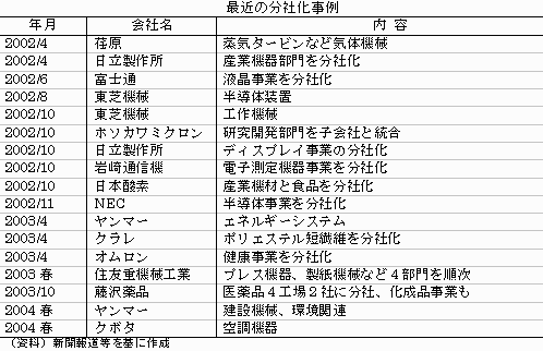 | 1.活発な分社化 最近の企業の動きをみると分社化が活発に行われている。今年に入っても、NECの半導体事業、富士通の液晶事業、東芝機械の工作機械や半導体装置事業など、大手企業の分社化が相次いで発表・実施されている。 企業はなぜ分社化するのだろうか?一般に言われている分社化のメリットには次のようなものがある。まず、分権化の推進である。事業部門が企業内部にある限り、その業績責任や業績評価は不十分なものにならざるを得ないが、分社化されると独立した法人として決算が行われ業績管理が徹底される。次にコスト削減が挙げられる。別会社となることで親会社と異なる人事・賃金体系を採用しやすくなり、人件費を削減することができる。第三点として、企業規模が小さくなることによって意思決定が迅速化し、経営が効率化される効果が指摘できる。第四点としては、本業とは異なる新規事業を展開するときに、事業リスクが遮断できるという効果がある。第五点として、中高年の雇用の受け皿として子会社が活用できると点が挙げられる。こうしたメリットを追求するために、各社は分社化を進めているとみられる。 |