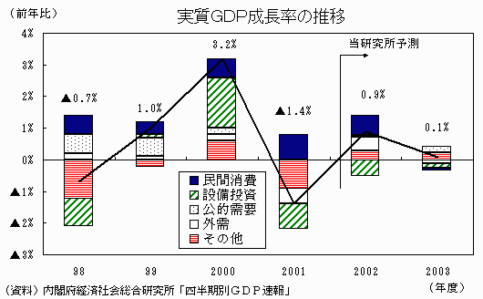 | 1.経済政策の選択と手順 経済政策は、ゴルフのスタンスに似ていると思う。ゴルフに必要なのは、適度な飛距離と正しい方向性である。とりわけ、方向性を間違うと致命傷になりかねない。それを防ぐのがスタンスである。スタンスは、ボールに対する姿勢とも言えるが、体の向きとともに、両足へのウエイトの置き方も重要である。このふたつの要素が備わって始めて、ボールは目標地点に向かって飛ぶのだ。 また、ゴルフの場合、野球と違って一回しかボールを打てない。やり直しがきかないのである。さらに、一度スタンスを間違えて放たれたミス・ショットが次のミス・ショットを誘発する、悪しきスパイラルにも注意しなければならない。したがって、スタンスを定めるに当たっては、ボールの置かれた状況をありのままに認識し、そのボールをどこに運んでいくかを判断し、それに合った体の向きと両足への比重の置き方を慎重に整えていくことが基本となる。 この体の向きが、採られるべき経済政策の選択であり、両足のウエイトの置き方は、政策の実施手順ということになろう。ゴルフボールが一国の経済で、最終目的(ホール・アウト)が国民の幸福(最大多数の最大幸福)とするなら、それを効率的に(より少ない打数で)実現する手段が、経済政策のスタンスなのである。 2.現政権・経済政策の成績表 実体経済の劣化が足もとで続いている。就業者数の減少、最悪水準の完全失業率、賃金労働者の所得減など雇用・所得環境の悪化だけを見ても、経済失政は明らかである。そのうえ、GDPデフレーターは94年以降(消費税引き上げのあった97年は例外として)、消費者物価指数は98年以降、継続して対前年マイナスを続けており、日本経済は、悪しきデフレ・スパイラルの淵にある。 小泉政権が発足した2001年度の実質GDP成長率は、前年度比1.4%減と大幅なマイナス成長を記録した。そして、当研究所では、02年度は、0.9%成長、03年度は、不良債権処理加速のデフレ圧力増大も加わり、景気回復は短命に終わってほぼゼロ・パーセント成長と予測している。他の民間シンクタンクの予測も、平均すれば同じようなレベルであり、日本経済は自律的回復が見込めないまま、減速、後退局面を迎えるという点では一致している。政府の03年度経済見通し+0.6%とは、かなりのギャップがあると言わざるを得ない。 外需の息切れもあって、設備投資回復のシナリオが崩れようとしているなか、比較的好調に推移していた個人消費も、厳しい雇用・所得環境を背景に、今後の伸びは期待しにくい。企業収益の改善も、デフレ下での人件費など固定費削減によるリストラを梃子とした「減収・増益」に過ぎず、持続可能性は疑問なうえ、これが家計所得の減少や失業の増加にもつながっている。こうして最終需要は弱いままの状態が続く。資産デフレも歯止めがかからず、不良債権処理は進まない。株式市場は長く危機的状況にある。まさに日本経済は、デフレの本当のこわさである「デフレ・スパイラル」の環がつながりそうな様相を呈しているのである。 とくに、昨秋の内閣改造で竹中経財相が金融相も兼務するようになって以降のデフレ圧力の増大は、極めて深刻であり、これを映じて、小泉内閣支持率は、昨年末の各種マスコミ調査で軒並み大きく低下している。残念ながら、現政権の経済政策の成績表は、現状「不可」を付けざるを得ない。ゴルフ(に例える)なら、すでにボールは次のショットが極めて難しいライにある状態と言える。早急なスタンスの調整が必要な所以である。 3.いま必要な経済政策のスタンスとは 現内閣の経済政策は、「構造改革なくして景気回復なし」というキャッチ・フレーズにある如くの構造改革路線である。昨年1月の『構造改革と経済財政の中期展望』には、構造改革をタテ糸とした政策のあり方が綿々と記述されているが、いかにも抽象的、楽観的、非現実的な作文に過ぎないと思われる部分が多い。この1年間の推移を経て読み返すと、さらにその感が強まる。 この「構造改革なくして景気回復なし」というスタンスは、二重の意味で誤まっているのではないか。ひとつは、景気回復のためにマクロ経済政策というよりは、構造改革を選択している点であり、いまひとつは、構造改革を優先することによって、デフレ圧力を増大し、デフレ・スパイラルを招いて、本来の目的である景気回復を不可能にした点である。政治の経済的な目的は、雇用と物価の安定化にあるはずだ。つまり現政権の路線は、政策の選択においても、順序においても間違った、構造改革という美名のもとでの単なるパフォーマンス狙いの一本足打法に過ぎず、景気回復には無策である、と言われても仕方あるまい。 必要なことは、原因と結果の関係を間違えることなく、経済の自律的かつ持続的な回復の道を探ることである。そのためには、まず、日本経済の置かれた状況(ボールのライ)を、ありのままに(謙虚に、正しく)認識