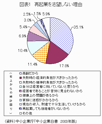 | 再起・再生には年齢が重要な要素に わが国における創業が停滞している原因の一つとして、一度事業に失敗すると再起することが難しいことが指摘されている。再起が難しい理由としては、(1)周囲の者が、事業に失敗した経営者はまた同じ過ちを繰り返すのではないかと考えてしまうという、失敗に対する日本国民の非寛容な態度、(2)倒産によって資産のほとんどを失ってしまう法制度や融資の在り方などが挙げられることが多い。しかし、倒産企業の実態がつかみにくいこともあって、こうした見方が正確かどうかはっきりしない面が残っている。 ところで、今年の中小企業白書は、倒産企業に対してアンケート調査を実施し、再起に関する興味深い調査を行っている。その中で注目されるのは、倒産企業の経営者の再起業の意思についての調査である。 再起業を志望しない理由をみると、「失敗時の経済的負担が大きかったから」や「失敗時の精神的負担が大きかったから」といった理由を大きく引き離して、「高齢だから」という理由が第一位になっている(図表1)。 |