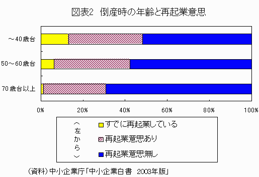 | また、倒産時の年齢と再起業意思の関係をみても、倒産時の年齢が高くなるにつれて再起業の意思を失う割合が高くなっている(図表2)。年齢が高くなるにつれて、肉体的に無理がきかなくなることや、年金の受給などによってあえてリスクを取らずとも生活できるためチャレンジ精神が失われることなどが、主たる理由であると思われる。 |