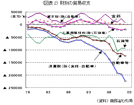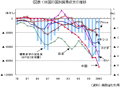 | ●強まる「対中貿易不均衡」への風当たり 米国では、対外貿易赤字国の筆頭に踊り出て、なおドルに対して固定相場制を取っている中国への風当たりが強まっている。議会でも、下院で中国にWTOのルール遵守と変動相場制への移行を求める決議案が採択される一方、いくつかの保護主義法案が提案されている。たとえば、(1)中国がフロート制に移行しなければ、中国製品に関税をかけるものや、(2)米国企業に企業内労働者の半数を米国内にとどめることを強制するもの、等である。保護主義的な法案は多くの弊害を伴い、また貿易相手国の報復を招く等、実効性が乏しく、成立するとする見方は少ない。実際、上記後者の法案が成立すれば、企業利益が半減し、レイオフはさらに増加すると見られている。 しかし、こうした主張もあながち根拠がないわけではない。主要通貨に対するドルの実質実効為替レートは、2002年初をピークに15%程度下落し、今後、海外の景気回復に伴って米国の輸出伸長が期待できるが、対中貿易に関しては人民元との交換レートが不変のため為替の影響の及ばない領域となっており、一層赤字が拡大する可能性があるからである。 ●効果の乏しい元レート調整による米国の赤字縮小 では、元レートの調整で米国の経常赤字が解消するのであろうか。米国の主要な貿易相手国との収支を見ると、確かに中国との赤字は急速に拡大しているが、最も目立ったのが中国であったにすぎず、EU等の他の貿易相手国との赤字も急拡大しており、元レートとの調整に成功しても貿易収支全体の改善とはならない。 ![]() ●赤字拡大の主因は消費財の輸入急増 一方、財別の貿易収支を見ると、消費財の赤字拡大が著しく、最近の赤字拡大の主要因となっている。生産コストの引き下げが厳しく求められる消費財においては、世界的に見て最も安いコストで生産できる地域からの輸入が優先される。2002年の消費財の輸入額は、資本財を抜いて最大の輸入品目となった。また、輸出入比率も1:4と主要な輸入品の中では石油に次いで高く、海外への生産移転も急速である。こうした流れはグローバリゼーションの一環であり押し戻せるものではない。消費財の主要な輸入国である中国と元レートの調整を行っても、より生産コストの低い国からの輸入に振り代わるため、米国の貿易収支全体の改善には繋がらないと思われる。 ![]() 実際に、中国から米国への輸出品目を見ると、その多くを軽工業品(衣類、履物、その他の加工品)が占めている。2002年の米国の対中貿易赤字1031億ドルのうち、56%がここに分類される。さらに木工・皮革・金属等の素材加工品を加えると貿易赤字の68%に達する。こうした品目の米国からの対中輸出は、輸入の10分の1にも満たない。残り3割の赤字は電気製品・機械類が占める。 結果的に、中国の輸出が米国の赤字を増幅した形であるが、消費財に関しては、米国の生産自体が海外に移転している。先頃、ジーンズ老舗のリーバイ・ストラウス社が4工場を閉鎖し、北米生産から完全撤退すると発表した。老舗ブランドをもってしても、もはや対外生産コストとの差を吸収できなくなりつつある。消費財を中心に、海外生産移転が進んでいる以上、特定国との為替調整を行っても、貿易収支への影響は一時的であろう。 ●雇用の悪化が起点の元レート攻撃 上記のように貿易統計を見れば、米国の経常赤字を元レートの調整に求めるのは無理があるが、なぜこうした論調が幅を利かせ、ついにはブッシュ大統領までが、元レートとの調整を主張するのであろうか。 大きな理由は二つある。一つは、雇用改善が遅々として進展を見せないのは、海外への生産移転や安い輸入品が雇用の回復を妨げているというものである。今年行った減税は、「雇用と成長」のためとし、ブッシュ政権では、雇用回復のためには成長促進が必要と説明してきた。しかし、7-9月期7.2%という高成長率にもかかわらず雇用の回復は遅れており、高成長率は生産性の上昇によってもたらされた形だ。雇用の回復がなければ、ブッシュ大統領の再選は危うい。選挙を控えて雇用の改善が遅々としているケースでスケープゴートが必要とされるのは、過去にも見られた。近いうちに保護主義が何らかの影響を経済政策に与えるとの見方も根強い。 元レートの調整にこだわるもう一つの理由は、中国の購買力の増加に繋がるからである。米国の対中輸出入比率は、1:5.7と米国の主要な貿易相手国の中でも不均衡が突出している。中国が経済面で注目されるのは、国内市場の将来性にあるが、元レートの調整が行われれば、購買力の拡大を加速することができる。米国がこうした手段に出たのは、中国がWTOに加盟して2年近く経つ中、米国からの輸出が伸びないことへの苛立ちがあろう。 ●中国の対応次第では、保護主義の台頭も 元レートの調整は、短期的に見れば、米国の貿易収支の改善や雇用の回復には期待できないのであるが、長期的には極め