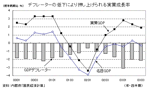 | 1.日本経済の現状-「芽」は出たのか? 日本経済は、2002年4-6月期以降、6四半期連続で実質GDPがプラス成長(前期比ベース)にあり、輸出・設備投資主導による緩やかな回復が続いている。2002年度は外需主導の成長であったが、03年度は、設備投資の伸びによって民需の伸びも高まるなど、一見バランスのとれた安定的な景気回復過程にあるように思われる。 しかし、下掲図表に見るとおり、名目成長率は低迷が続いており、物価の下落基調・デフレーターの大幅な低下によって実質成長率が押し上げられているに過ぎないとも言える。つまり、デフレ経済下で名目GDPと実質GDPが大きく乖離しているということである。97年には521兆円もあった名目GDPは、今や498兆円と8年前の水準に逆戻りしている。実質GDPで経済成長を語るのはインフレ時代の発想であり、企業経営や財政運営にとって重要な名目ベースで見れば、日本経済は水準も方向も不振を抜け出ていないのである。実質GDPを除けば、生産、雇用、物価、民間給与、株価等、経済データの中で、小泉政権発足前と比較して改善しているものはほとんど無く、日本経済の現状が「改革の芽が出つつある」と果たして言えるかどうかは、疑問であろう。 2.持続可能性と二極分化 問題は、輸出・設備投資主導で緩やかながらも回復基調にある経済が持続可能性を有しているかどうか、すなわち、企業部門の改善が家計部門にも波及し、GDPの6割弱を占める個人消費に点火する形で、自律的な景気回復局面に移行できるか否かである。残念ながら、リストラ効果剥落による企業収益の先細り、増税など負担増のほか家計の雇用・所得環境に改善が期待できないこと、円高のリスクがぬぐえないこと、頼みの米国経済にも持続性に問題がある点などを考慮に入れれば、全面的な拡大局面への移行シナリオは立てにくいと言わざるを得ない。デフレが続くなかで見かけ上実質GDPは押し上げられるも、日本経済は持続可能性は期待できずに、依然として厳しい局面にあると見られる。 今ひとつの懸念は、デフレ経済のもとで、日本社会に二極分化(格差の拡大)が進行している点である。大企業と中小企業、製造業と非製造業、大都市と地方、官と民、貧富の格差、高齢層と若年層、就業者と失業者・・・、デフレの勝者と敗者がいて、経済社会の矛盾や「合成の誤謬」に気づかないまま、二極分化の度合いが深まる。そのようななかで、我々は自信や希望を失い、将来のビジョンを描けないでいないだろうか。この弊害の最たるものが、失業、倒産、「経済・生活問題を理由とした自殺」の増大であり、とくに、一段と深刻化する若年者の雇用不安が日本経済の将来にとって極めて大きな問題であることは、筆者が前回の当コラム(「マクロ政策をわらう者は・・・」)において指摘したとおりである。 3.経済政策の責任-問われる遂行力 このようなデフレ下で需給ギャップ(総需要が総供給を下回る状態)が存在する、いわゆるデフレ不況を脱却し、二極分化も是正しながら持続的成長を図るためには、需要の増加を通じてGDPギャップを縮小させていくマクロ経済政策が必要である。そのためには、企業のリストラや政府の財政再建など各経済主体が正しいと思って取組む効率化(ミクロの改革・改善)が、縮小再生産の「マイナスの渦」を伴って、結果的には自らの利益を阻害してしまうという、「合成の誤謬」や「悪循環の構造」を断つことが肝要だ。デフレ下では、マクロ経済における「リストラの解」は存在しない。需要の増加を通じてギャップを縮小させていくとは、あくまでも名目の売上げや税収を増大させるということである。 「Rising tides raise all ships」(満ち潮はすべての船を持ち上げる)という言葉がある。このような状態に経済を持って行けるのは、マクロ経済政策だけである。構造改革も立派な経済政策ではあるが、これは供給サイドの強化策であり、むしろGDPギャップを拡大すること、デフレ下でこれを優先的に強行すれば、失業者の増大とデフレの更なる深刻化を招くことは、すでに小泉構造改革路線の実績と合わせ、ここ一両年の経済論争において決着のついた点であろう。「構造改革なくして景気回復なし」というキャッチ・フレーズは、天井(潜在成長率)が高くなれば我々の身の丈(現実の経済成長率)も伸びる、と言っているようなものであったが、これが実現するという期待の道筋は、すでに事実上途絶えている。 現政権の構造改革路線は、3回目の予算編成を迎えた昨年末の時点で、「改革工程表」のどの主要項目を見ても、実現不可能か、あるいはきわめて実現が困難だと予想せざるを得ない状況に陥ったのではないか。せめて、現実の経済を動かす新年度の政府予算案において、資源配分の効率化を通じて経済の活性化を目指すという、まさに構造改革という名の経済政策の真髄を世に問う責任が政府には望まれたのであるが・・・。「デフレ経済下では、財政当局と金融当局が