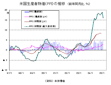 1、川上から迫るインフレ圧力 米国の景気は堅調である。米国の10-12月期成長率が前期比年率3.8%(=確報、当初発表は3.1%だった)と上方改定され、1-3月期についてもエコノミストの予想平均は3.7%(3/10付ブルーチップ誌)と堅調予想である。こうした中、3月の雇用者は11万人増と市場予想の半分に留まったにもかかわらず、発表直後の株・債券市場は、インフレ懸念が後退したとして上昇した(その後、原油価格上昇等により下落)。市場の関心は、これまでの成長持続からインフレに移ってきていると言えよう。 景気堅調下での原油価格の上昇は、インフレ懸念材料の最たるものだが、今回の上昇は、中国の消費増等の需給面が絡むため、これまでの戦争による突発的な高騰とは異なる要素を持つ。急速な上昇を見せた後だけに、先行きの価格低下を見込む向きが多いものの、先日は米国の大手証券会社が105ドル/バレルへの一段の上昇の可能性を指摘する動きもあり、足下の原油価格は史上最高価格を更新している。 さらに、原油価格に加えてその他の国際商品価格が上昇を見せている。この背景には、世界的な金融余剰を背景にした投機資金の流入が指摘されているが、米国では3年来ドル安が続いている事情が加わり、インフレ懸念を増幅している。1月はコアPPI(エネルギー・食料を除いた生産者物価)が前月比+0.8%と98年12月以来の上昇幅となり市場の波乱を招いたが、2月は+0.1%に落ち着いた。ただし、コアCPIでは1月+0.2%の後、2月は+0.3%となり、この問題への市場の懸念は、かなり神経質なものとなっている。 PPI・CPIとも原油価格乱高下の影響を受けやすいため、最近では、コア指数に注目する傾向が強くなっているが、各コア指数の推移を前年同月比で見ると、いずれも1年以上にわたって上昇傾向にある。特にPPIについては、原油だけでなく国際商品の価格上昇等が原材料や中間財での上昇をもたらしており、中間財の中でも耐久財材料等への影響は顕著である。また、最終財については値上げを抑制しているものと見られるが、原油価格・景気堅調が持続すれば、今後、最終財PPIやCPIへの波及の可能性は、一層強まってこよう。