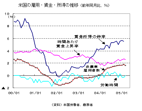 昨年の大統領選挙時は、ブッシュ政権の弱点として攻撃の的となっていた雇用であるが、昨今の堅調な回復により、賃金上昇が近いのではないかとの懸念を呼んでいる。この点、時間当たり賃金上昇率は、2月の雇用統計では前月比+0.1%、3月は同+0.3%となり、前年同月比でも伸び率は昨年初に底を打ち、緩やかな上昇に転じている。 確かに、労働時間がなお横這いの推移にあることに加え、雇用者数についても、回復しているとはいっても漸くリセッション前の水準に戻ったレベルであり、この間、毎月17・8万人はあったと考えられる自然増の労働滞留者が、今後、雇用市場に参入すると考えれば、雇用の需給は、依然タイトな状況にはないと見るべきだろう。 しかし、雇用者増により前年同月比ベースでの賃金所得全体の伸びは6%に接近していることから、賃金上昇率の上昇トレンドが現状の緩やかなペースで持続するとしても、雇用増が景気を押し上げ、インフレ懸念を強めることは十分想定されよう。