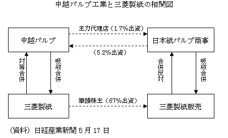 1.合併撤回のウラにプライドあり? 5月16日に、中越パルプ工業と三菱製紙は、10月に予定していた合併を白紙撤回すると発表した。1月31日の合併発表から3か月余りで、合併計画が破綻したことになる。新聞報道によると、合併における「対等の精神」が合併計画撤回の主たる原因となったようである。合併が破談に至った経緯は、中越パルプ工業が、その主力販売代理店である日本紙パルプ商事による三菱製紙販売(三菱製紙の子会社)の吸収合併案を提示したことが引き金となった。三菱製紙の佐藤社長は合併実現のため、子会社の吸収合併提案を受け入れたが、三菱製紙および三菱製紙販売の社員が「対等の精神」に反するとして激しく反発し、役員たちも合併反対に回ったため、やむなく合併計画の撤回に至ったと伝えられている。 合併に対する反発の強さは、三菱製紙販売の95%の社員の合併反対署名が即座に集まったことに如実に示されている。三菱社員が対等合併にこだわったのは、三菱製紙および三菱製紙販売には中越パルプ工業と日本紙パルプ商事に対し「格上意識」があり、吸収合併という屈辱的な扱いをそのプライドが許さなかったためと伝えられている。相手企業との対等性に強硬にこだわる従業員の反対が合併撤回にまで追い込んだことは、異なる組織との融合に対する拒絶感の凄まじさを感じさせる。