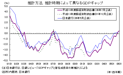 | 1. 注目されるGDPギャップ デフレ脱却がいよいよ現実のものとなりつつある中、経済全体の供給力と総需要との乖離を表す「GDPギャップ(=需給ギャップ)」の注目度が高まっている。 内閣府は、デフレ脱却の判断基準のひとつとしてGDPギャップを挙げているが、今年の「経済財政白書」では、GDPギャップが2005年10-12月期に約8年ぶりにプラスに転じたという試算を示した。また、日銀は7月の金融経済月報で、マクロ的な需給ギャップが需要超過状態に入っているとの判断をもとに、景気判断を前月までの「着実に回復」から「緩やかに拡大」に変更した。 GDPギャップは、物価変動圧力を見るための重要な指標のひとつであり、最近のGDPギャップの動きからは、日本経済の潜在的な供給力を実際の需要が持続的に上回ることにより、物価上昇圧力が徐々に高まっていることが読み取れる。ただし、GDPギャップはあくまでも推計値であり、その数字はかなりの幅をもって見るべき性質のものである。それにもかかわらずGDPギャップのプラス転化が、あたかも絶対的な真実であるかのように伝えられている現状には少なからず違和感を覚える。 2. 推計方法、推計時期によって異なるGDPギャップ GDPギャップ=(現実のGDP-潜在GDP)/潜在GDPで表される。このうち、現実のGDPは内閣府の公表データによって知ることができるが、潜在GDPは直接観察することができないため、推計によって求められる。推計方法、推計に用いるデータ等が違えば、潜在GDPの推計結果も変わり、そこから計算されるGDPギャップも変わってくる。 潜在GDPの概念にも大きく分けて2通りの考え方がある。ひとつは、労働、資本をフル稼働させた場合のGDP(=最大概念の潜在GDP)、もうひとつは労働、資本が過去の平均的な稼動状態にある時のGDP(=平均概念の潜在GDP)である。最大概念の潜在GDPを使うと、GDPギャップは常にマイナスの値をとるのに対し、平均概念の潜在GDPを使うと、労働、資本が平均的な稼動状態にあるときにGDPギャップはゼロとなり、それよりも稼働率が高ければプラス、低ければマイナスとなる。 日銀はこの春、潜在GDPの再推計を行ったが、その際に潜在GDPの概念をそれまでの「最大概念」に基づくものから、国際的に主流となっている「平均概念」に基づくものに変更した。日銀が潜在GDPの概念を変更した背景には、GDPギャップがマイナスのままでゼロ金利を解除するというのは説得力に欠けるという判断も働いたものと思われる。 ここで、内閣府推計のGDPギャップ(06年7月公表「経済財政白書」による)と日銀推計のGDPギャップ(06年5月公表の日銀レビュー「GDPギャップと潜在成長率の新推計」による)の動きを比べてみよう。 下図から分かる通り、「バブル崩壊以降、ほぼ一貫してマイナスを続けてきたGDPギャップが、足もとでは若干のプラスに転じている」という大きな流れは両者とも変わらない。しかし、より詳細に見てみると、99年頃、01年末から02年初にかけて、内閣府推計のGDPギャップは4%を超えるマイナスとなっていたのに対し、日銀推計のGDPギャップは3%前後とマイナス幅が小さくなっている。また、今回の回復局面において、GDPギャップがプラスに転じた時期は、日銀推計値の2005年4-6月期に対し、内閣府推計値ではそれより2四半期遅い2005年10-12月期となっている。これは、日銀と内閣府で潜在GDPの推計方法がかなり違っているためである。 また、推計を行った時期の違いによってもGDPギャップは変わってくる。5年前の平成13年度版経済財政白書(01年4-6月期まで推計)と今年の経済財政白書を比べると、推計方法は基本的に同じであるにもかかわらず、四半期毎の動きがかなり異なっており、プラスとマイナスの符号が異なる期も散見される。5年前はGDP統計が1995年基準であり、GDPの実質化の手法が固定基準年方式だった(現在は2000年基準、連鎖方式)ため、当時と現在では実質GDPの計数自体が大きく変わっていることが主な理由である。